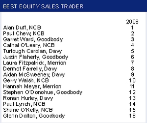 in this category which was just introduced this year. In last year’s survey, Duff came in third position for the ‘Best Equity Sales’ title behind Merrion’s Adrian O’Carroll and Davy’s David Smith. However, in this year’s survey, the category was divided in two, with Duff winning the sales trader award, and O’Carroll the sales person award.